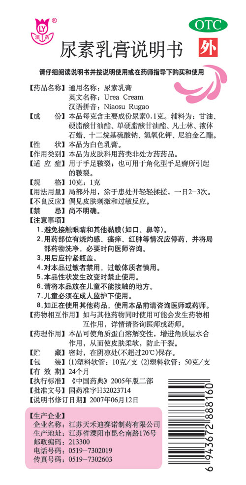 [药品名称] 通用名称:尿素乳膏 英文名称:Urea Cream 汉语拼音:Niaosu Rugao [成 份] 本品每克含主要成份尿素0.1克。辅料为:甘油、硬脂酸甘油酯、单硬脂酸甘油酯、凡士林、液体石蜡、十二烷基硫酸钠、氢氧化钠、尼泊金乙酯。 [性 状] 本品为白色乳膏。 [作用类别] 本品为皮肤科用药类非处方药药品。 [适 应 症] 用于手足皲裂,也可用于角化型手足癣所引起的皲裂。 [规 格] 10克:1克 [用法用量] 局部外用,涂于患处并轻轻揉搓,一日2-3次。 [不良反应] 偶见皮肤刺激和过敏反应。 [禁 忌] 尚不明确 [注意事项] 1、 避免接触眼睛和其他黏膜(如口、鼻等)。 2、 用药部位有烧灼感、瘙痒、红肿等情况应停药。并将局部药物洗净,必要时向医师咨询。 3、 用后应拧紧瓶盖。 4、 对本品过敏者禁用,过敏体质者慎用。 5、 本品性状发生改变时禁止使用。 6、 请将本品放在儿童不能接触的地方。 7、 儿童必须在成人监护下使用。 8、 如正在使用其他药品,使用本品前请咨询医师或药师。 [药物相互作用]如与其他药物同时使用可能会发生药物相互作用,详情请咨询医师或药师。 [药理作用] 本品可使角质蛋白溶解变性,增进角质层水合作用,从而使皮肤柔软,防止干裂。 [贮 藏] 密封,在阴凉处(不超过20℃)保存。 [包 装] (1)塑料软管:10克/支(2)塑料软管:50克/支 [有 效 期] 24个月 [执行标准] 《中国药典》2005年版二部 [批准文号] 国药准字H32023714 [说明书修订日期] 2007年06月12日